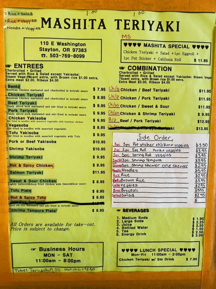 "Mashita Teriyaki" is a Japanese sushi bar located in Stayton, Oregon, offering a wide variety of teriyaki dishes, yakisoba, and other flavorful entrees. The menu includes options like Beef Teriyaki, Chicken Teriyaki, Pork Teriyaki, Salmon Teriyaki, and more, all served with white rice and pickled cabbage. Customers rave about the delicious Chicken Teriyaki and Yakisoba, praising the thick and tasty sauce. Despite its unassuming exterior, the food at Mashita Teriyaki impresses diners with its quality and generous portions. Whether you're looking for a quick takeout meal or a late-night snack, this spot is a go-to for satisfying Japanese cuisine in the area. With options for vegetarians and a casual atmosphere, Mashita Teriyaki is a must-try for those craving flavorful and affordable Japanese dishes.